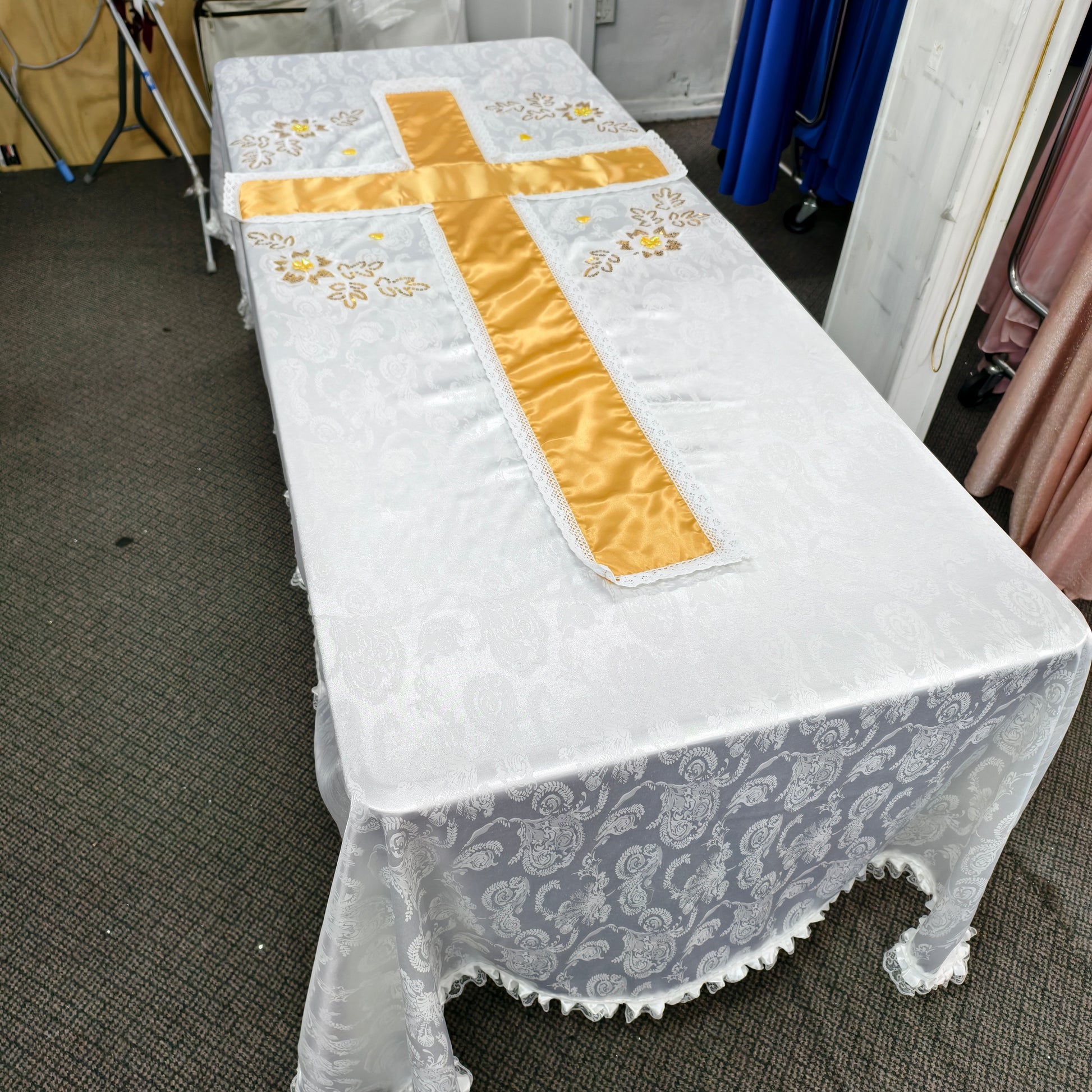This elegant coffin cover fabric features a beautifully crafted golden cross at the center, symbolizing reverence and sanctity. Four delicate lace embellishments surround the cross, adding a touch of romance and sophistication. The fabric is soft to the touch, with subtle floral patterns that enhance its luxurious appearance. Ideal for religious settings, ceremonial decorations, or high-end crafts. Affordable price with excellent quality.