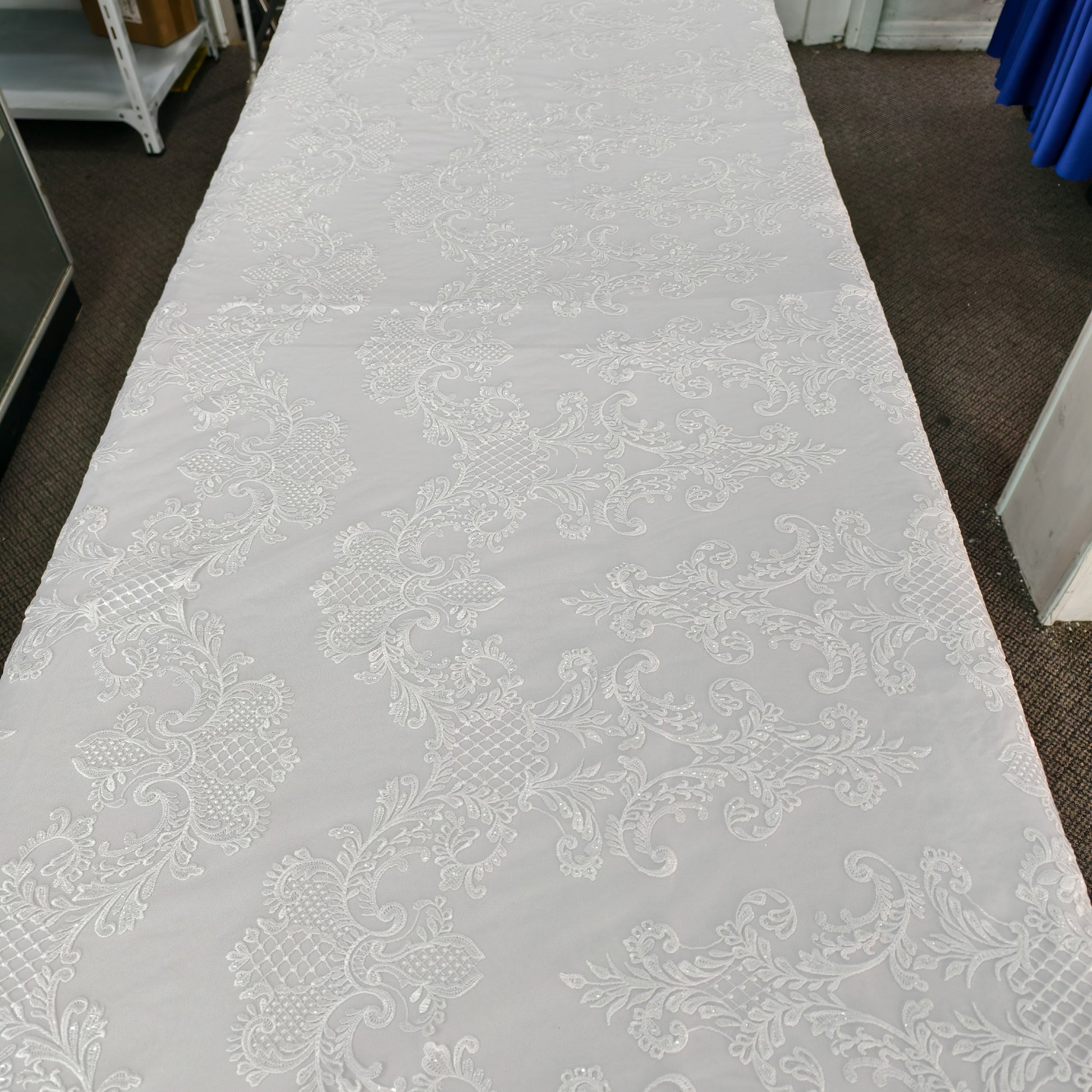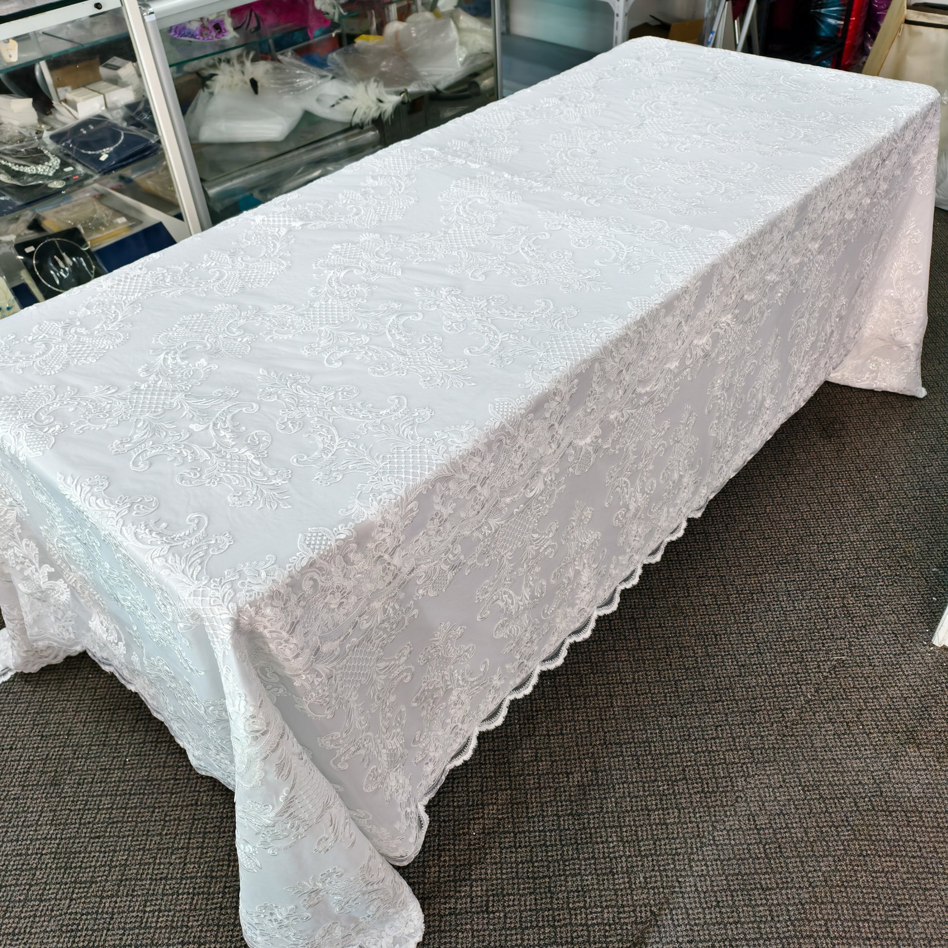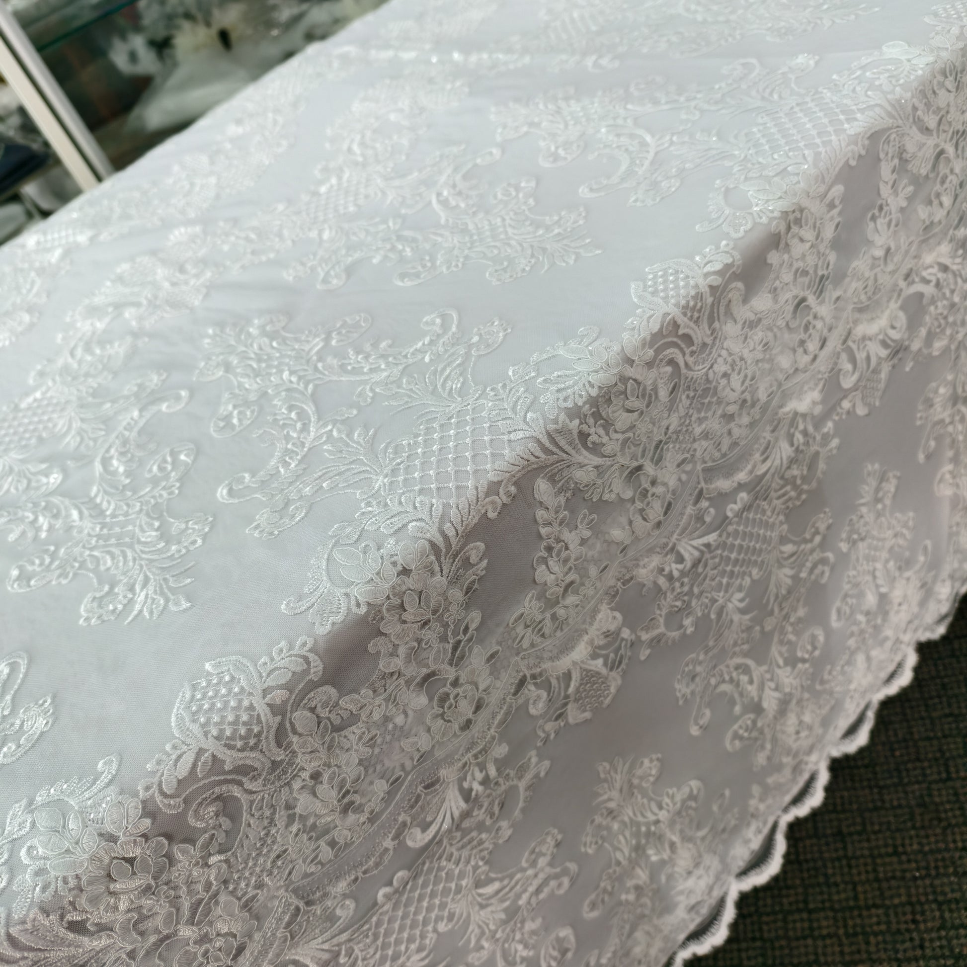 A timeless lace coffin cover featuring elegant patterns and premium quality, with a wider-than-standard size—perfect for a respected elder.